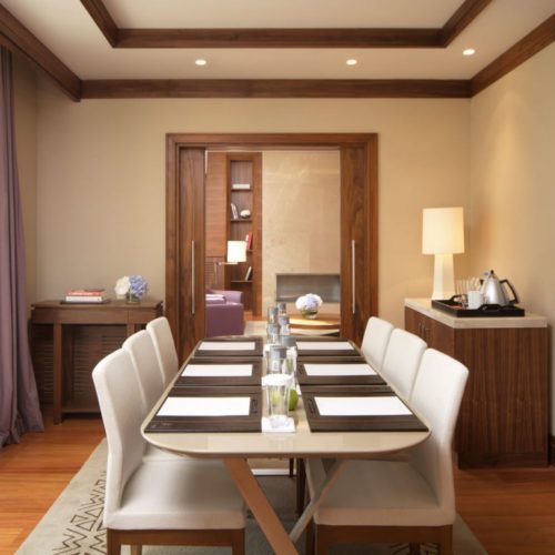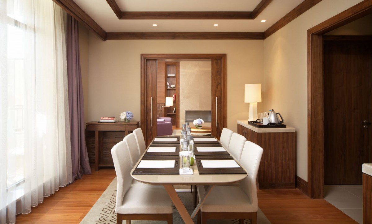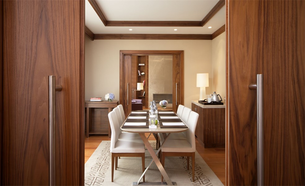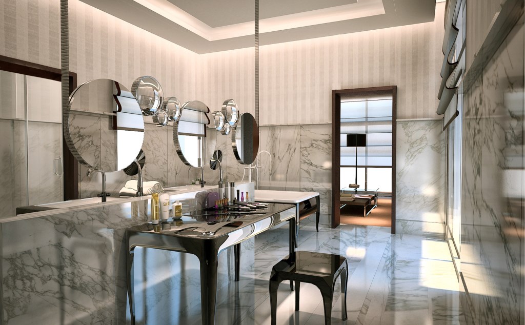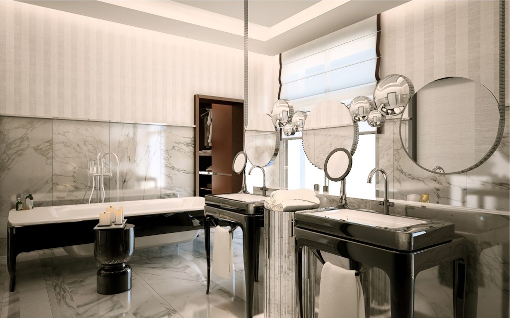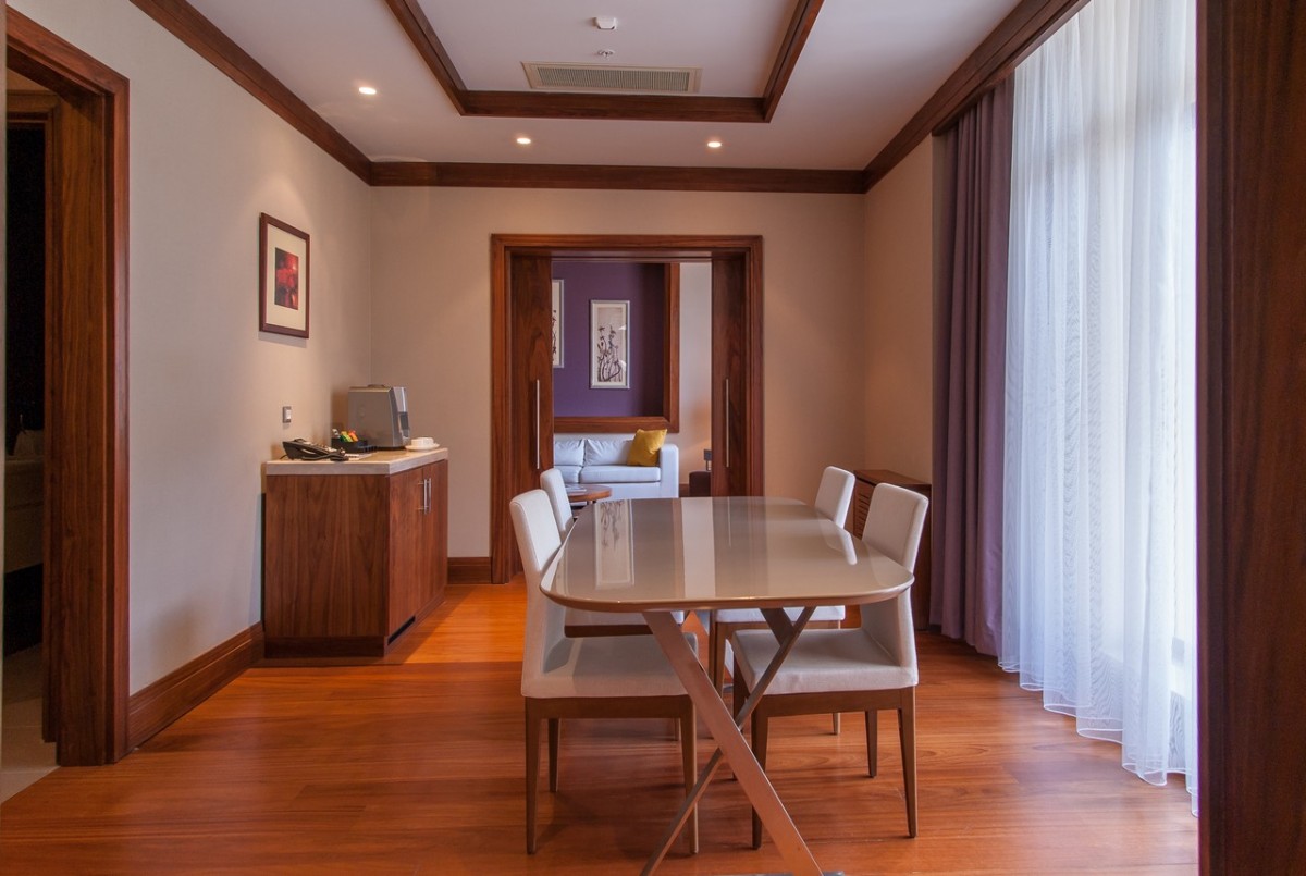 Номер имеет три комнаты. Общая площадь составляет 90 кв.м. Есть просторный балкон с шезлонгами и столиком. Присутствует большая двуспальная кровать. Телевизор поворачивается на 360 градусов. С другой стороны находится зеркало. Есть камин, который делает пространство особенно уютным. В столовой можно организовать обед на 6 персон. В ванной присутствует ванна-джакузи. В широкой гардеробной можно расположить все вещи.