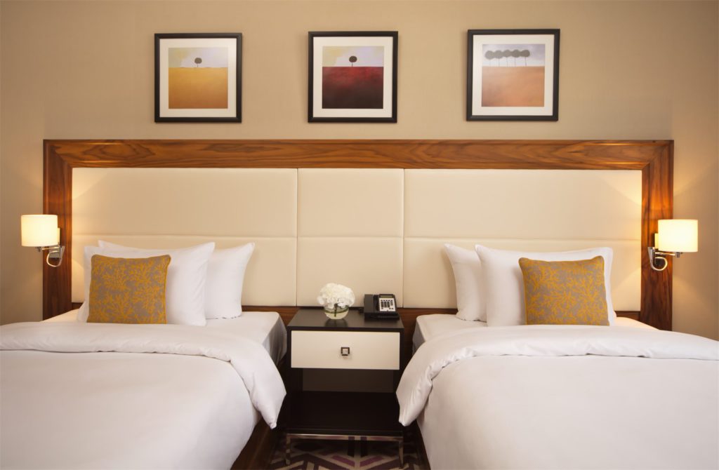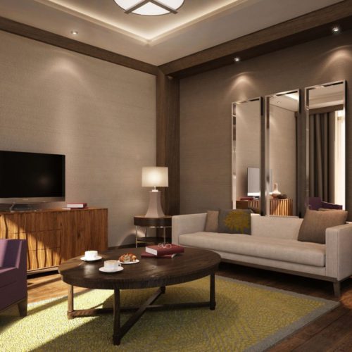 Общая площадь составляет 42 – 45 кв.м. Можно выбрать вариант с видом на горы Кавказа, улицу или внутренний двор. Есть 2 односпальные кровати. В номере присутствует зал и спальня. Телеэкран поворачивается на 360 градусов. С другой стороны находится зеркальная панель. Присутствует диван и кофейный столик.