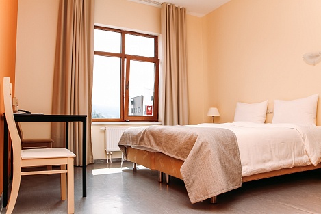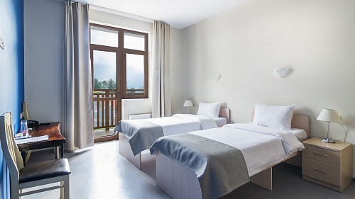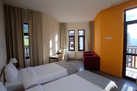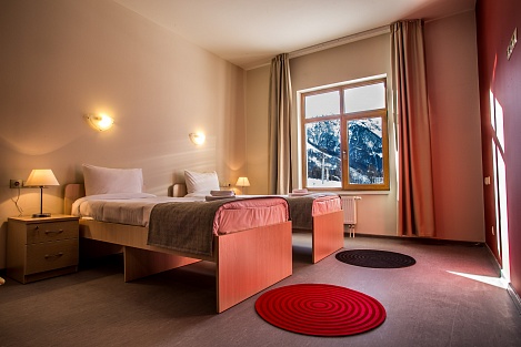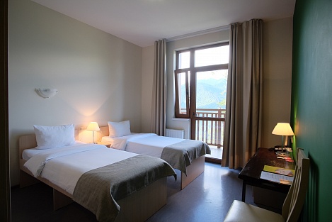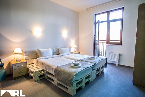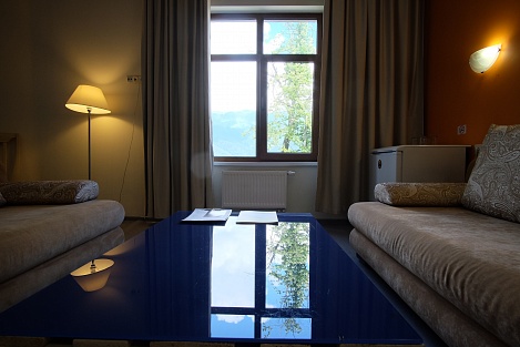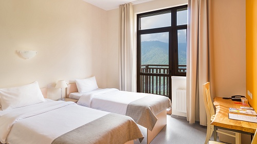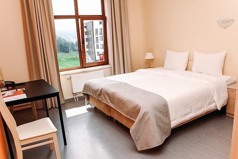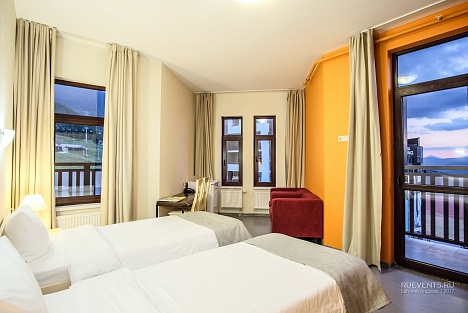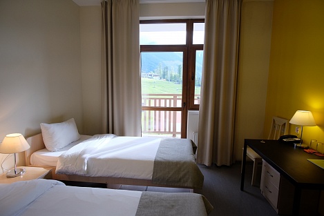 Остановиться можно в чистых комнатах, исходя из персональных предпочтений. Современная мебель, стильный дизайн, лаконичность понравятся путешественникам. Есть зона для отдыха, тумбочки, косметические наборы, фен. Из окон можно любоваться впечатляющими видами гор.