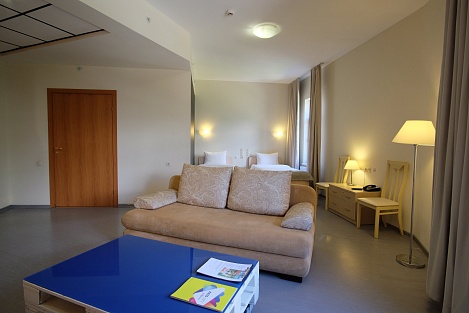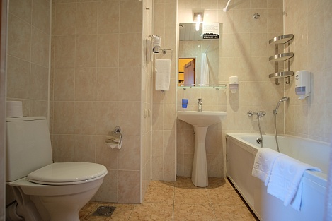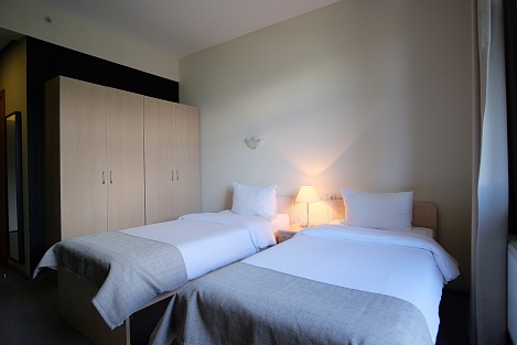 В комнате две раздельные или одна большая кровать. Есть диван. Присутствует бесплатный Wi-Fi, телефон, чайная/кофейная станция. Есть необходимые принадлежности для душа, халат, тапочки.