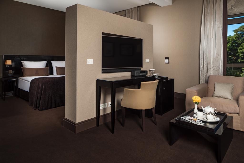 Присутствует кондиционер, TV с плоским экраном. Есть мини-бар и персональная ванная комната.