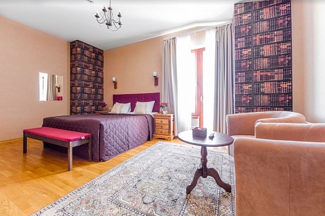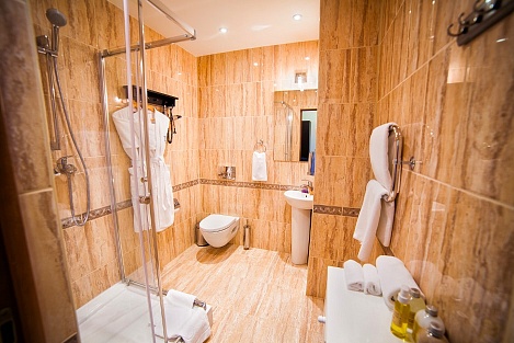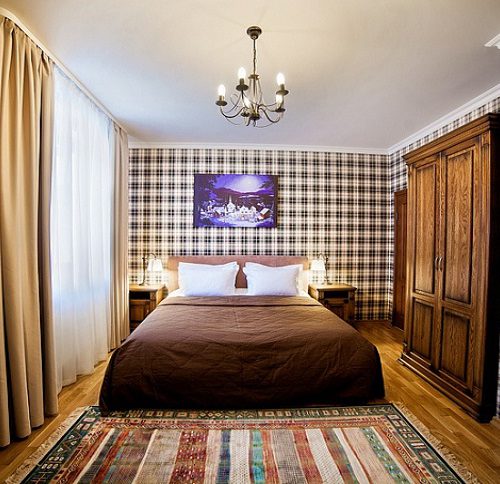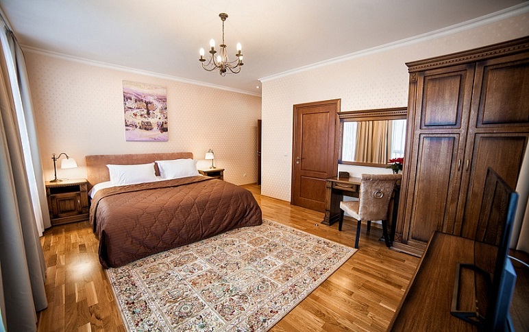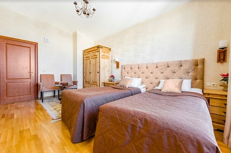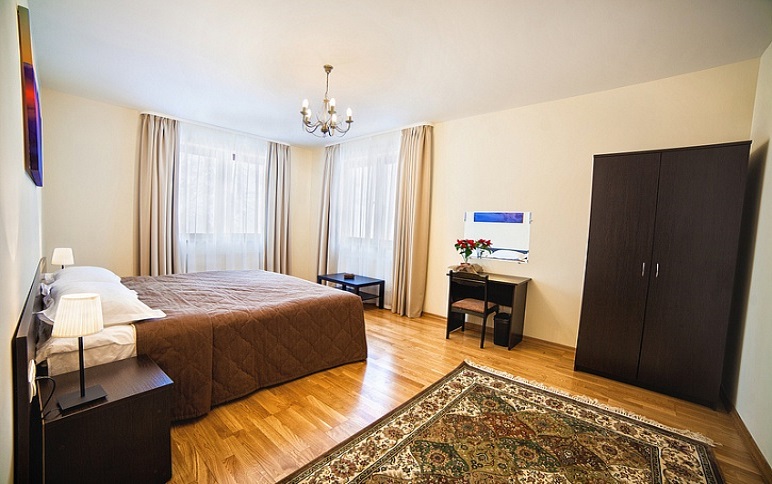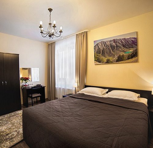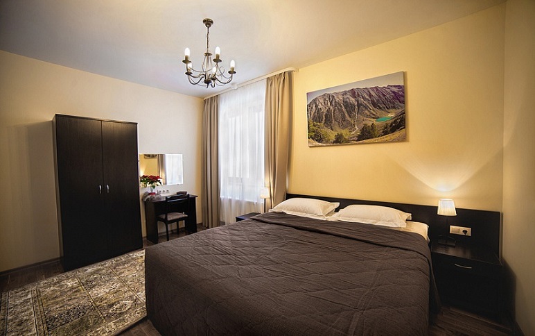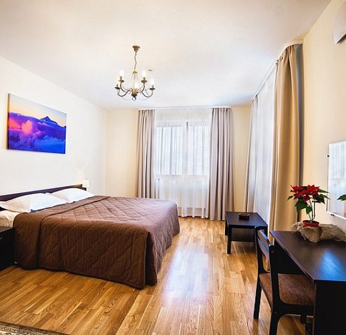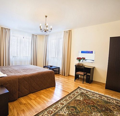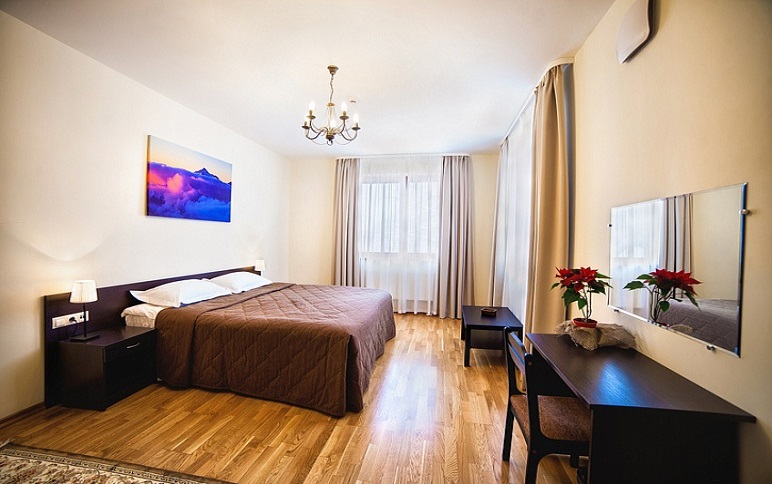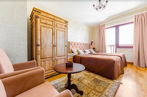 Просторный и уютный номер для 2 человек. Здесь есть большая кровать, ванная, косметические принадлежности, махровые полотенца. Предоставляются тапочки и халат. На большом телевизоре удобно будет смотреть сериалы, фильмы, важные матчи. Качественная дубовая мебель придает изюминки интерьеру. Есть балкон с прекрасным видом на горы.