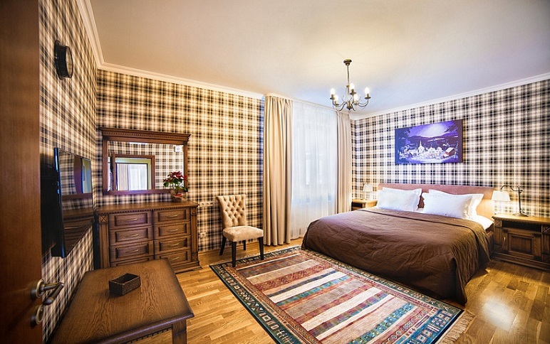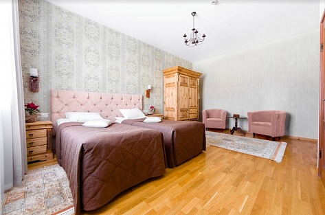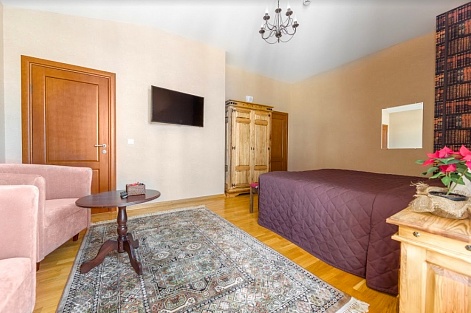 Уютный небольшой номер для 2 человек. Есть большая двуспальная кровать, ванная с косметическими принадлежностями. Предоставляются махровые полотенца, халаты, тапочки. Насладиться любимыми сериалами и фильмами поможет большой телевизор. Прочная мебель сделана из дуба.