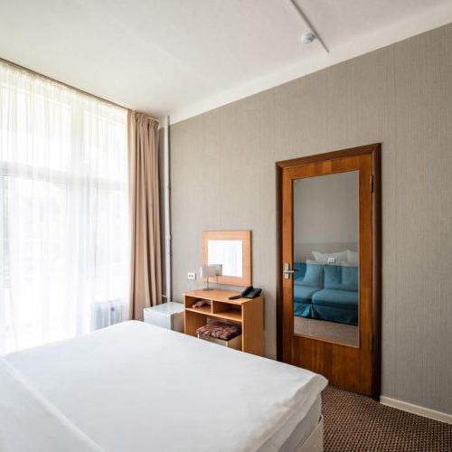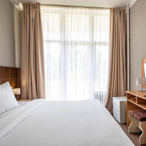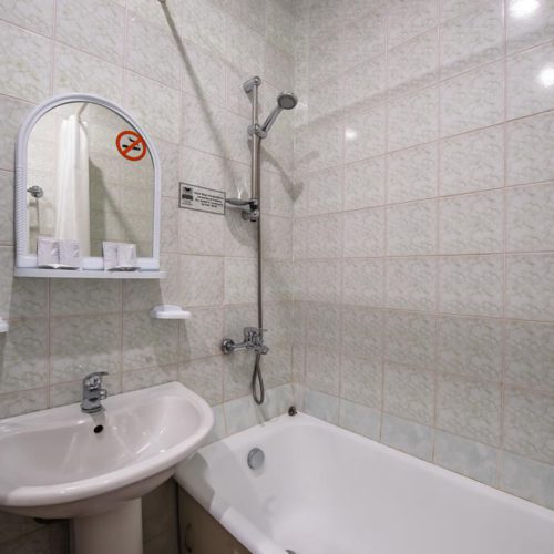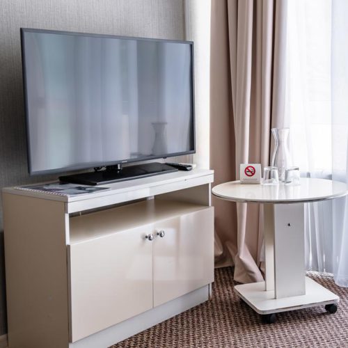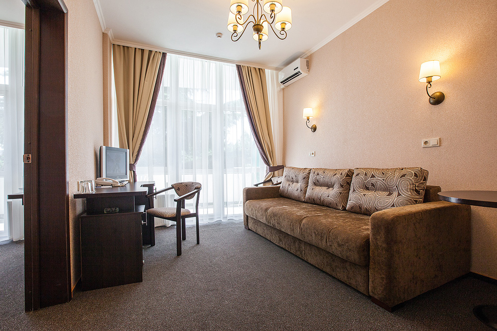 Включает гостевую, зону спальни, ванную. Есть уютная мебель, ТВ, шкаф, тумбочки, письменный стол. Присутствуют все косметические принадлежности. Всего 32 кв.м.