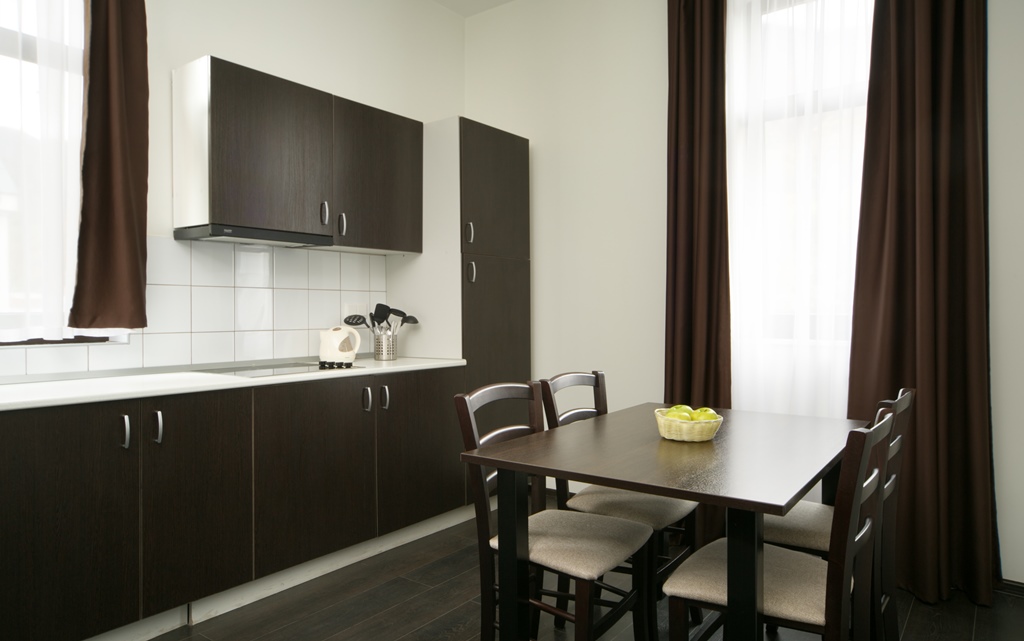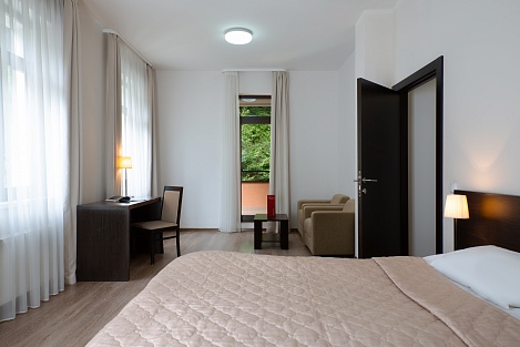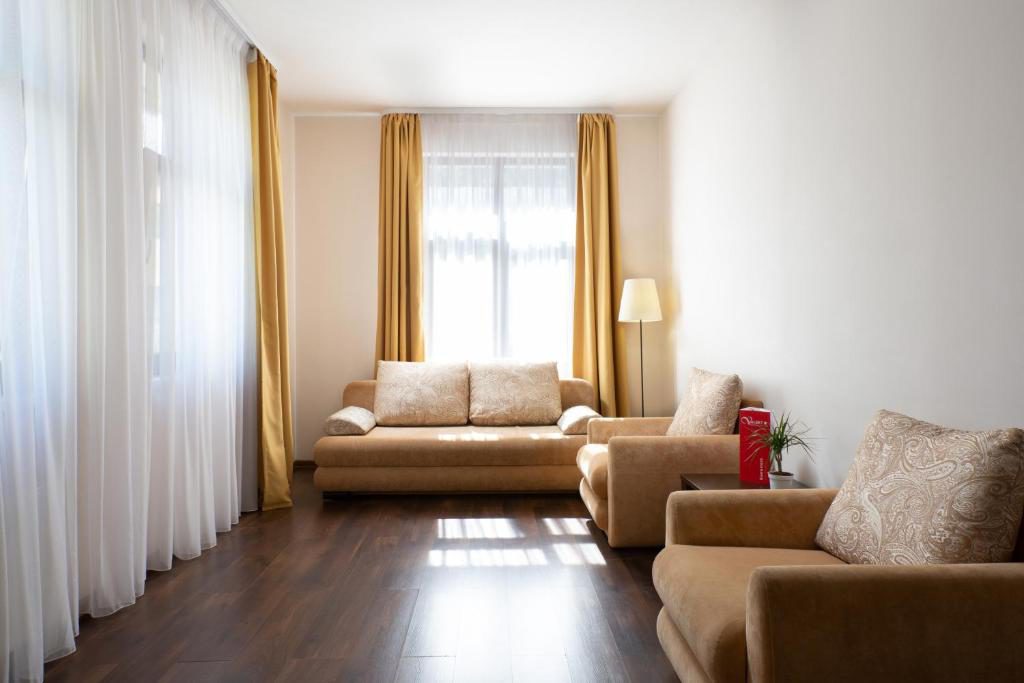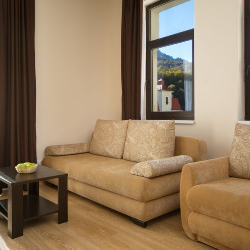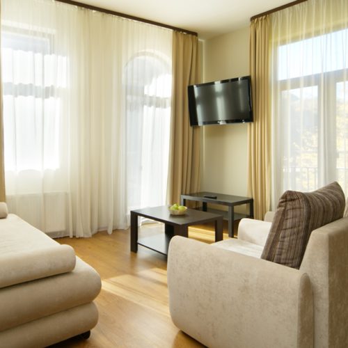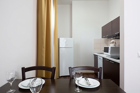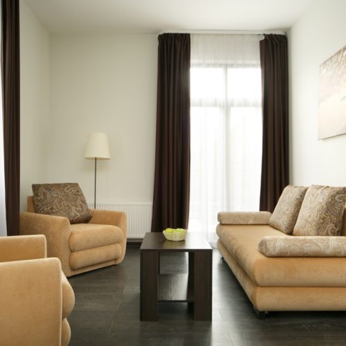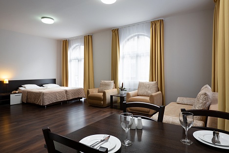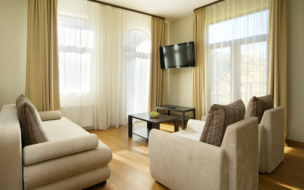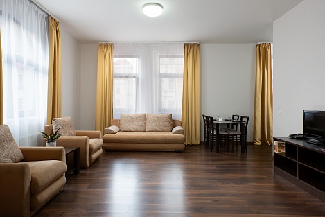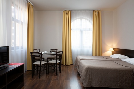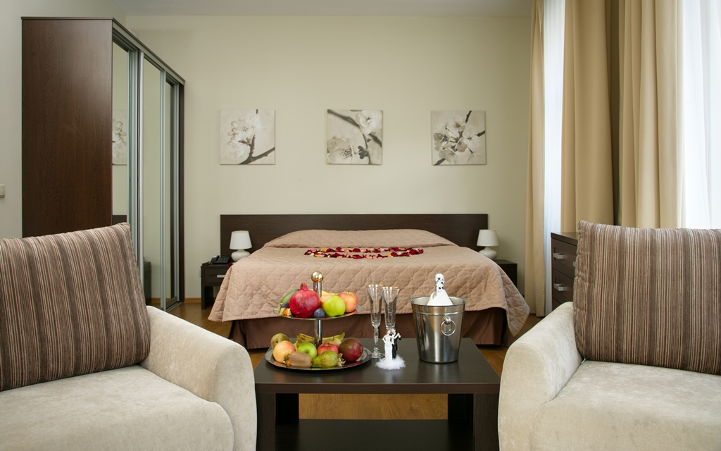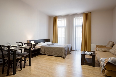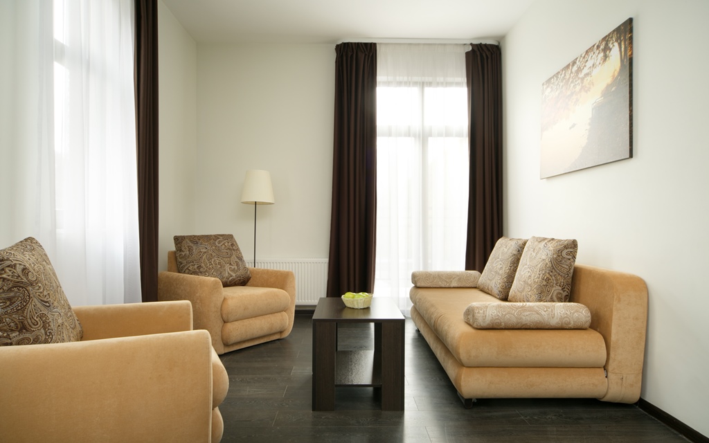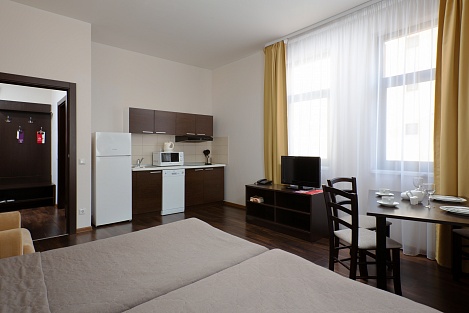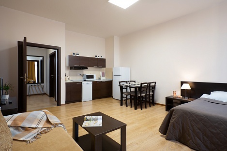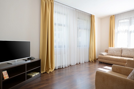 Здесь находится спальная комната с 2 раздельными местами отдыха или односпальной king-size. В гостиной есть диван-кровать. Для непринужденного времяпровождения присутствует плоский телевизор. Можно смотреть с друзьями и родными понравившиеся фильмы. Там можно приготовить еду в любое время. Для этого есть все: микроволновка, наборы посуды, стол, стулья, приборы. В шкаф поместится вся одежда. Благодаря бесплатному Wi-Fi вы всегда будете на связи с родными и коллегами по работе. В ванной присутствуют нужные косметические средства, фен, полотенца. Номера могут быть оборудованы для людей с ограниченными возможностями.