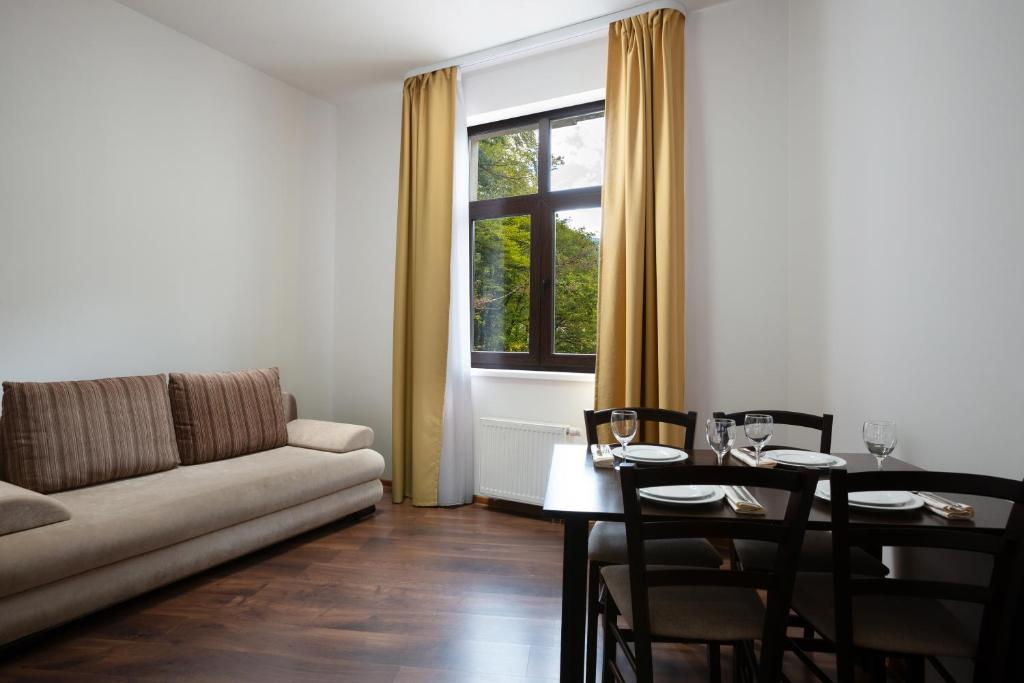 Интерьер в нежных тонах придется по душе всем туристам. Непринужденно можно отдохнуть перед телевизором с плоским экраном. В гостиной присутствует диван-кровать. Кухня оборудована современной мебелью и хорошей техникой для приготовления различных блюд. Здесь можно собраться с друзьями и выпить ароматный чай. В ванной есть все туалетные принадлежности, полотенца, фен. На балконе приятно любоваться горами, лесом или окрестностями.