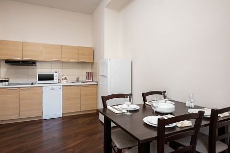 Размер составляет 46 кв.м. Есть плоский ТВ, с помощью которого можно смотреть увлекательные фильмы. В кухне находится холодильник, куда можно класть продукты. Для приготовления пищи есть варочная панель, электрический чайник, набор посуды и другие предметы. В номере присутствует вся необходимая мебель, есть сушилка для белья. Стильный интерьер придется по душе ценителям красоты. В ванной находятся необходимые косметические средства для принятия душа. Бесплатный Wi-Fi позволит оперативно загружать и просматривать видео.