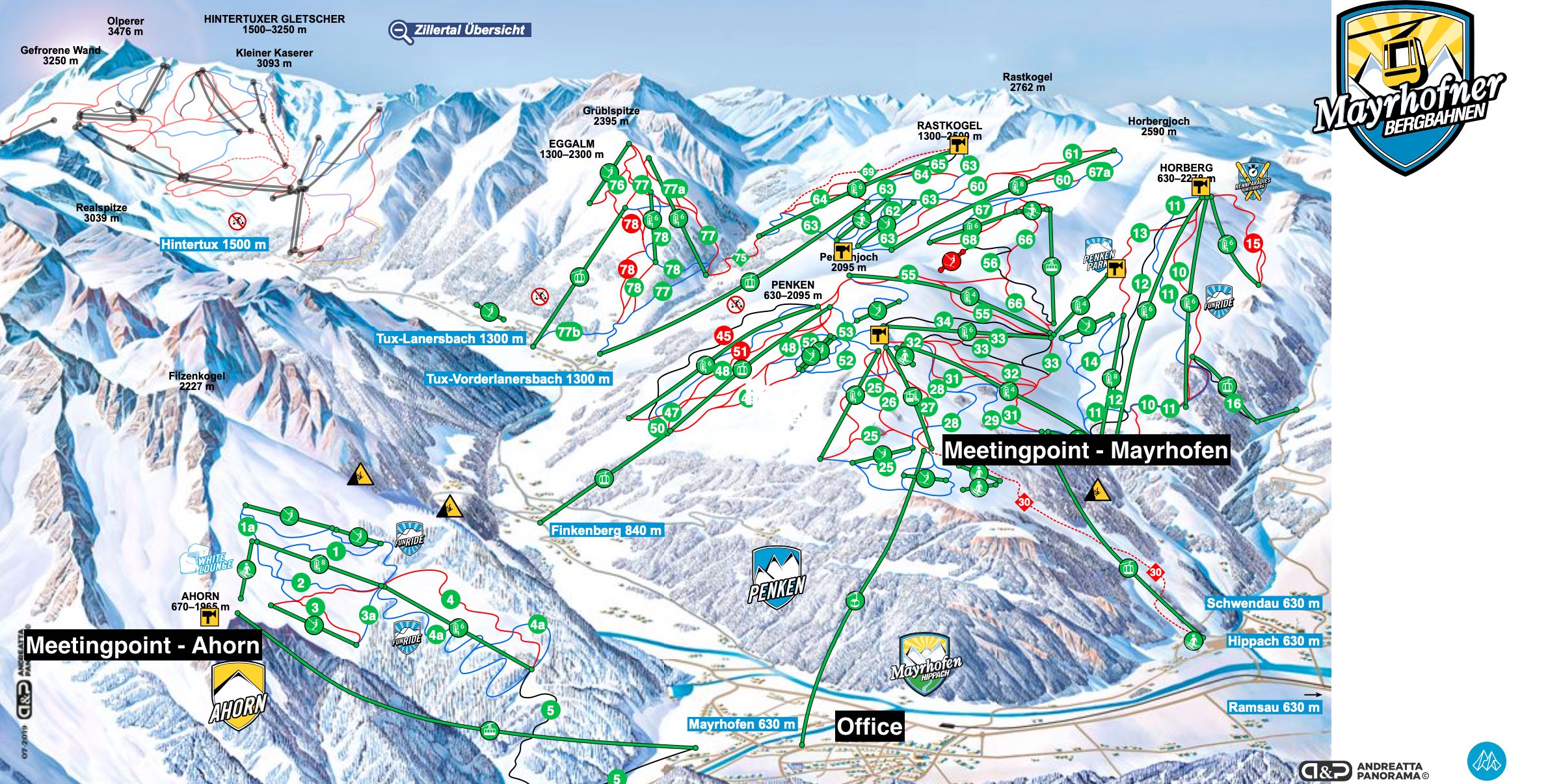 Для индивидуальных занятий Вы можете выбрать любую локацию, представлены на карте ниже — место встречи на горе Ahorn и Penken!