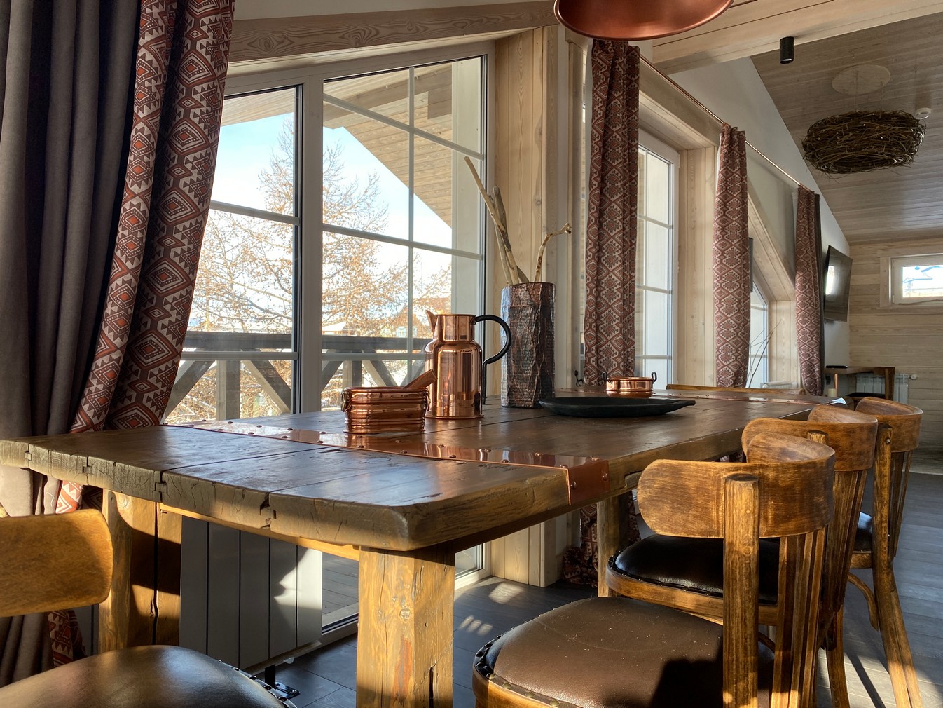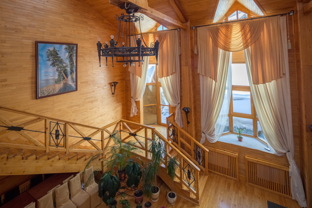 Гостиничный комплекс построен преимущественно из ценных пород деревьев — сибирской сосны, ясеня, дуба. Номера с роскошной обстановкой, соответствующей высочайшим мировым стандартам. Стандарты обслуживания и кухня удовлетворят даже самых взыскательных гостей.