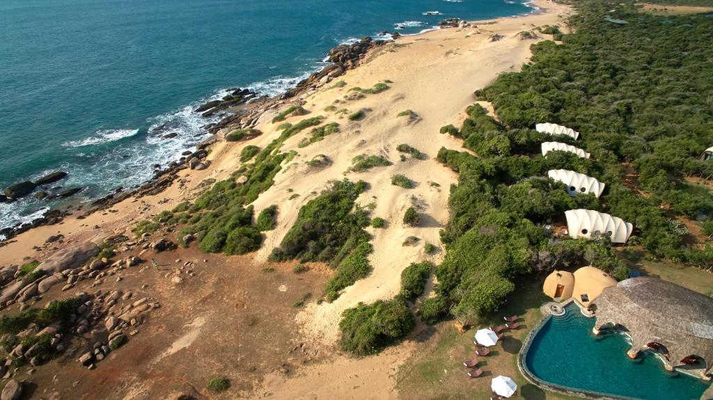 Расположенный на границе национального парка Яла, Wild Coast Tented Lodge предлагает уникальное сочетание роскоши и дикой природы. Гости размещаются в 28 коконах-шатрах, спроектированных в гармонии с окружающим ландшафтом, с видом на океан и джунгли. Отель получил награду UNESCO за дизайн и является частью компании Relais & Châteaux.