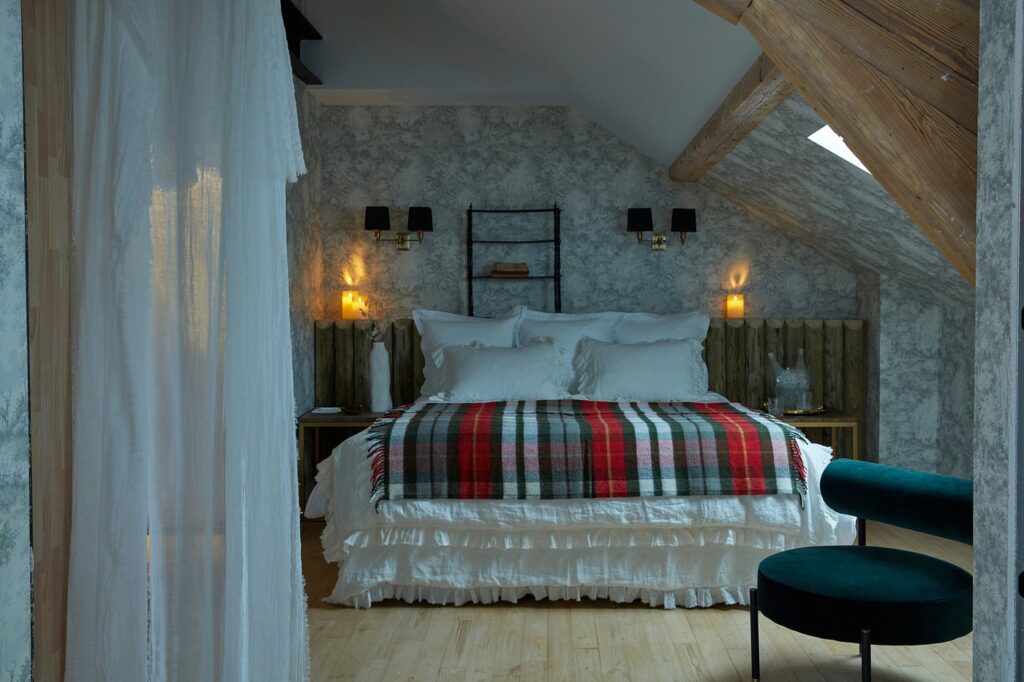 Уютный семейный номер площадью 28 кв.м., подходит для размещения семьи с ребенком. Здесь есть просторная двуспальная кровать и отдельная односпальная кровать, отделяющаяся от основного помещения пологом. Из окна ванной комнаты открывается вид на горы. Особая изюминка номера — то, что он расположен на последнем этаже отеля, является мансардным.