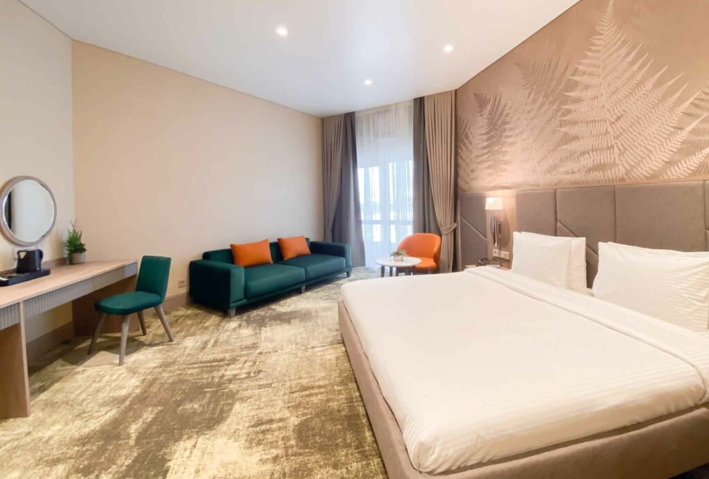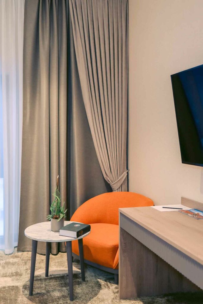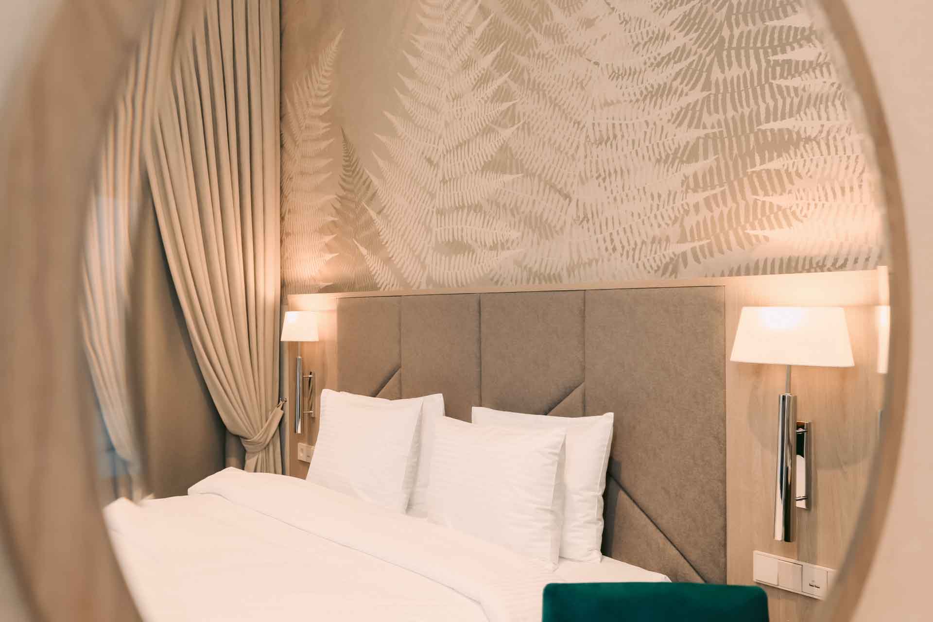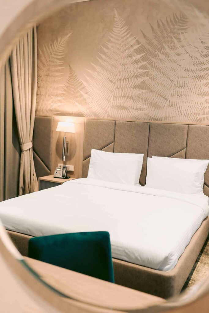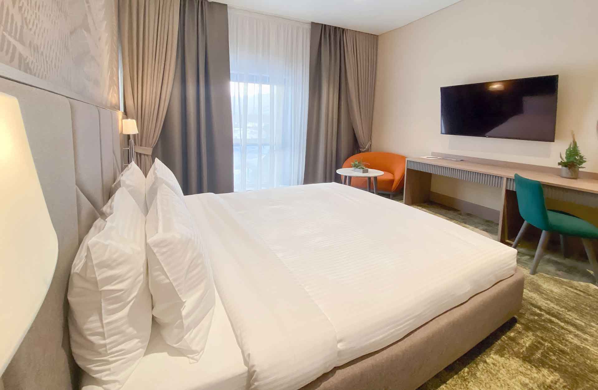 Светлый, эргономичный номер площадью 20 квадратных метров. Светлые бежевые оттенки с парой ярких акцентов, двуспальная кровать Queen Size с бельем премиум-качества и удобным матрасом, небольшая рабочая зона, телевизор со спутниковыми каналами, чайная станция, электронный сейф — ваше пребывание здесь будет максимально удобным и приятным. В номере есть всё, что нужно, и даже немного больше: например, косметическое зеркало в ванной комнате и теплый пол для идеального температурного режима в любое время года.