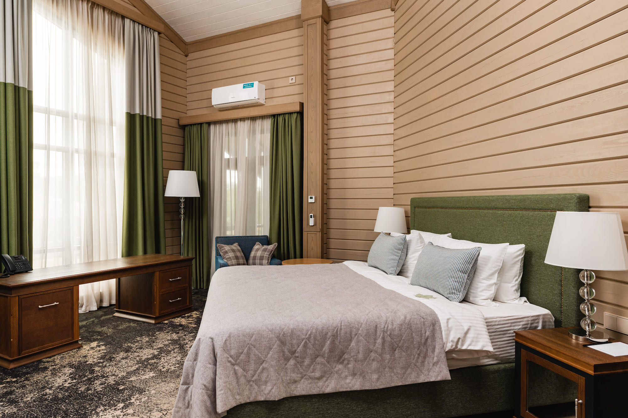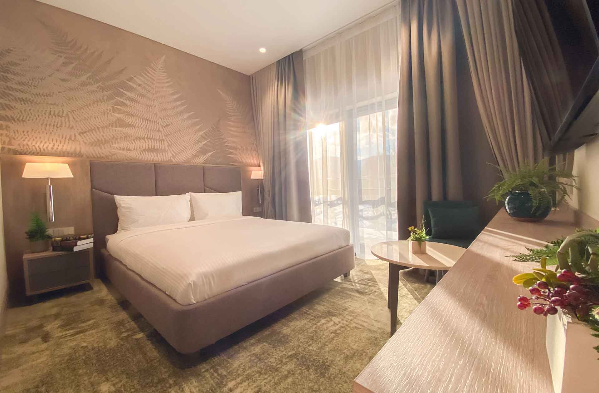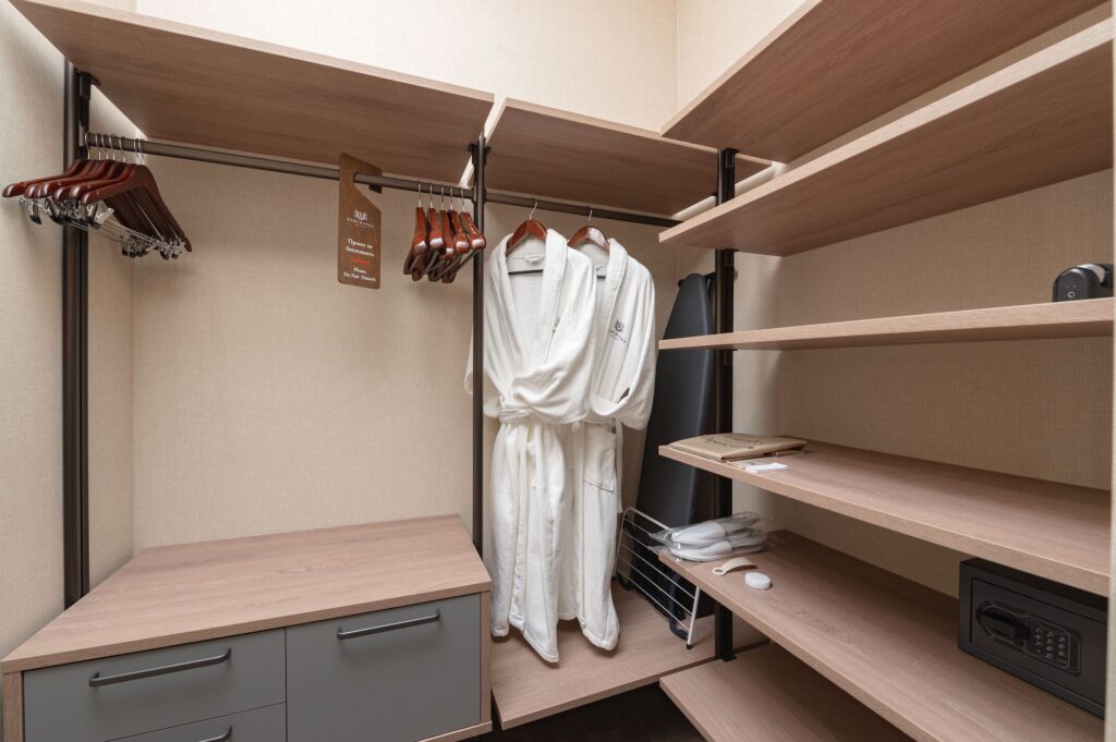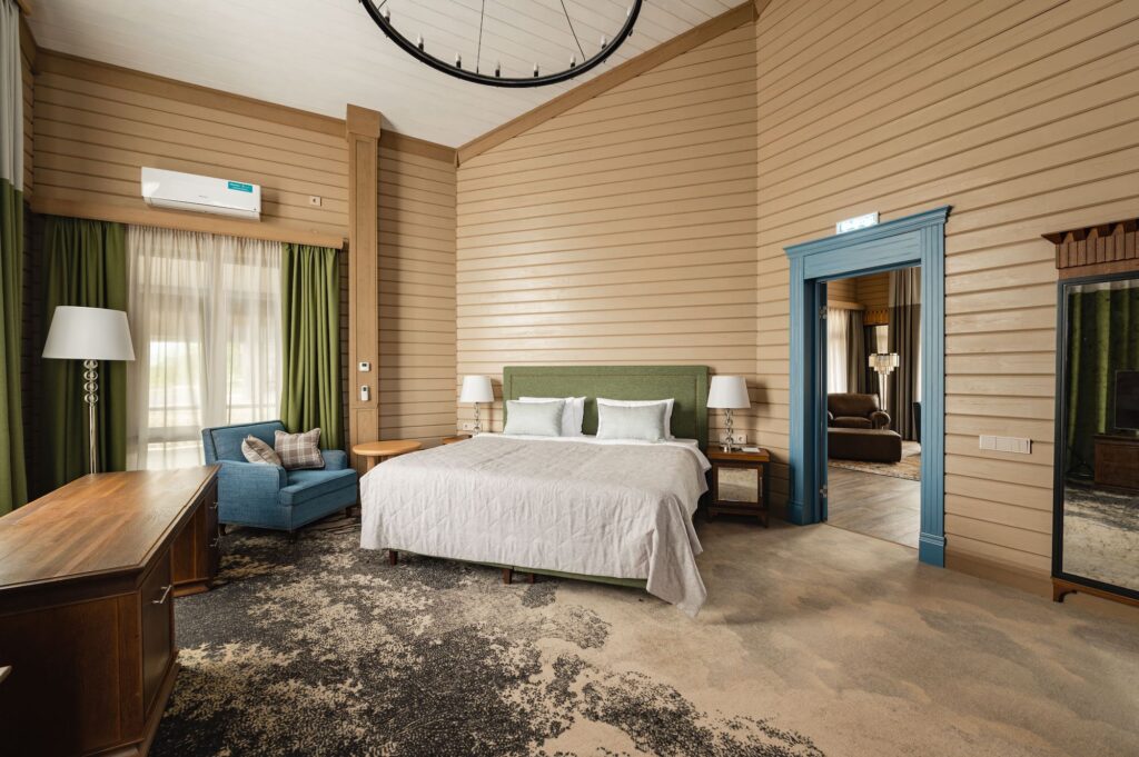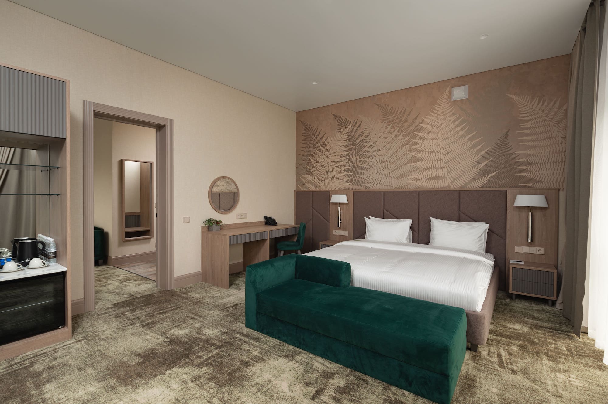 Лаконичный авторский дизайн, две комнаты и удобство в каждой детали. Площадь номеров этой категории — 48 квадратных метров, они подойдут как для роскошного отдыха пары, так и для семьи с детьми. На кровати EURO (200*200) — изготовленные по спецзаказу эксклюзивные матрасы и премиум-белье, также есть раскладывающийся диван со спальным местом 150*180. По запросу можно установить дополнительную детскую кроватку. В номере также есть рабочая зона, места для хранения вещей, чайная станция и капсульная кофемашина, телевизор, гардеробная, видовой балкон.