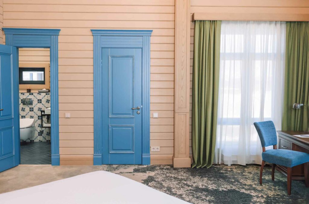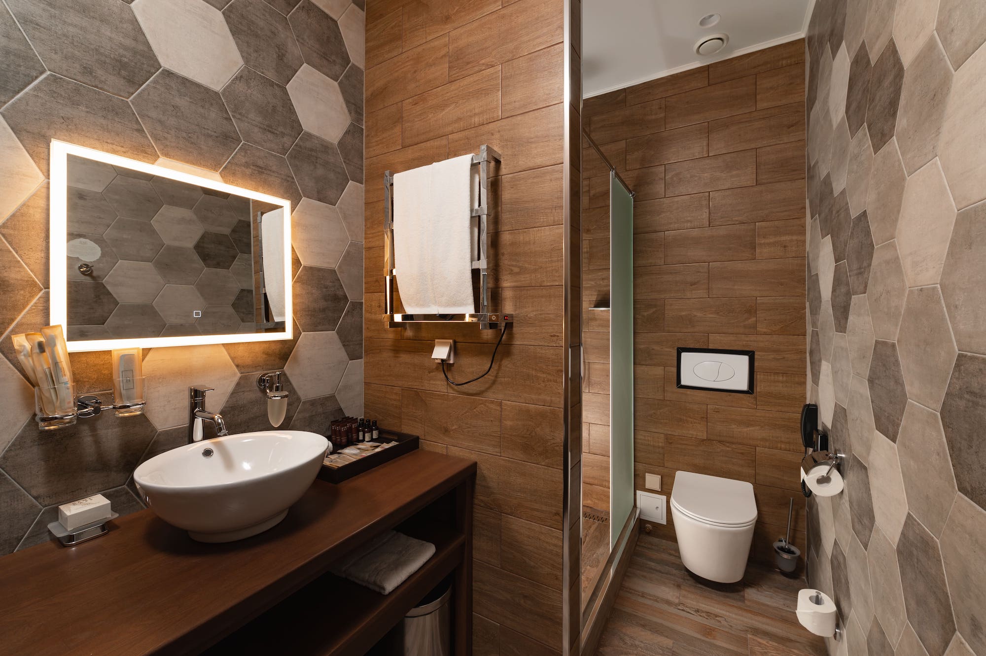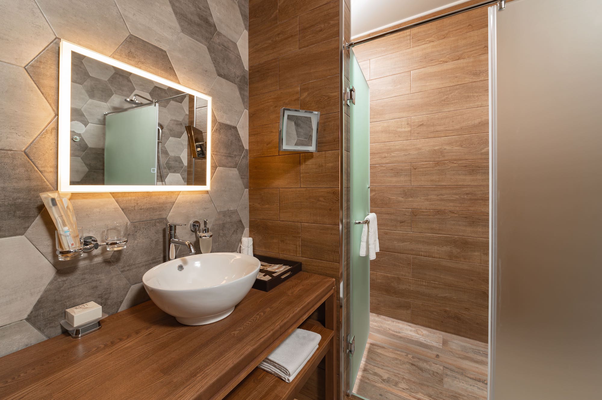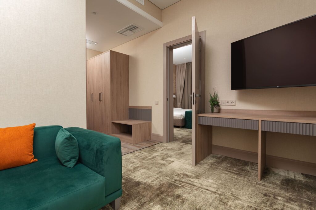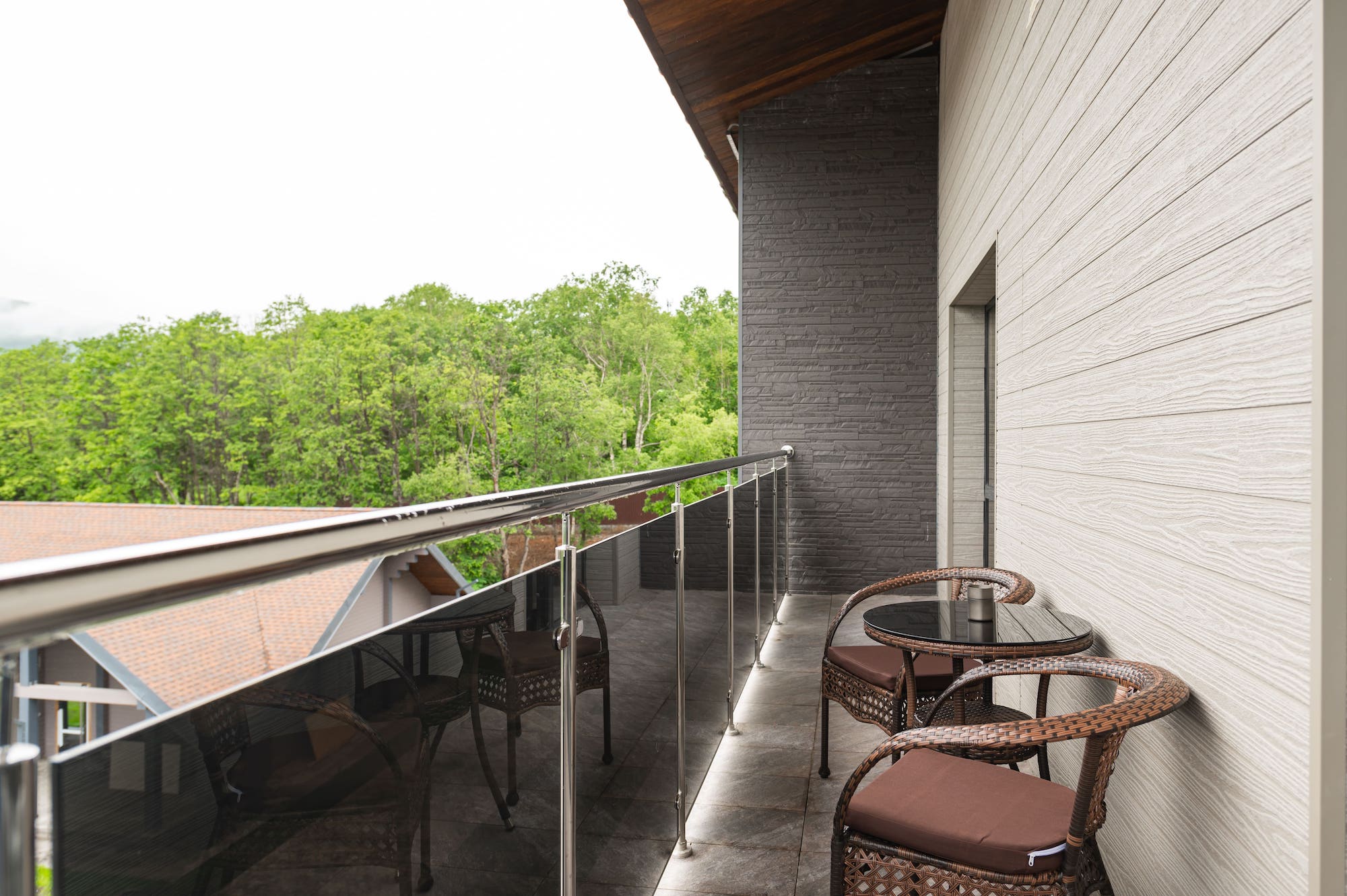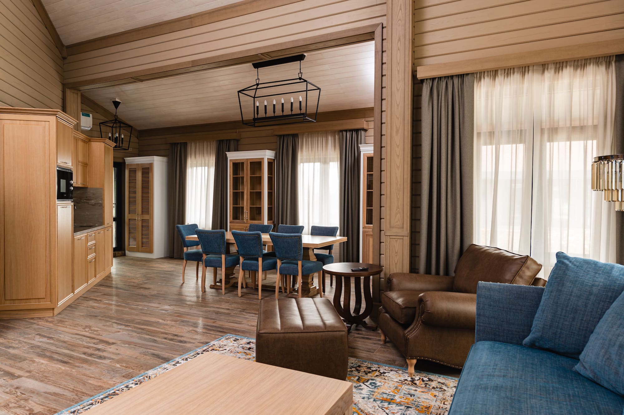 Лаконичный авторский дизайн, две комнаты и удобство в каждой детали. Площадь номеров этой категории — 48 квадратных метров, они подойдут как для роскошного отдыха пары, так и для семьи с детьми. На кровати EURO (200*200) — изготовленные по спецзаказу эксклюзивные матрасы и премиум-белье, также есть раскладывающийся диван со спальным местом 150*180. По запросу можно установить дополнительную детскую кроватку. В номере также есть рабочая зона, места для хранения вещей, чайная станция и капсульная кофемашина, телевизор, гардеробная, видовой балкон.