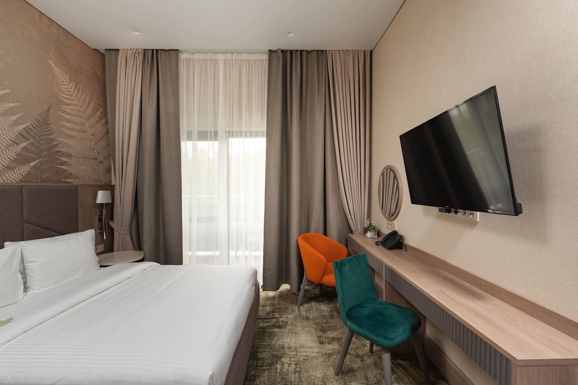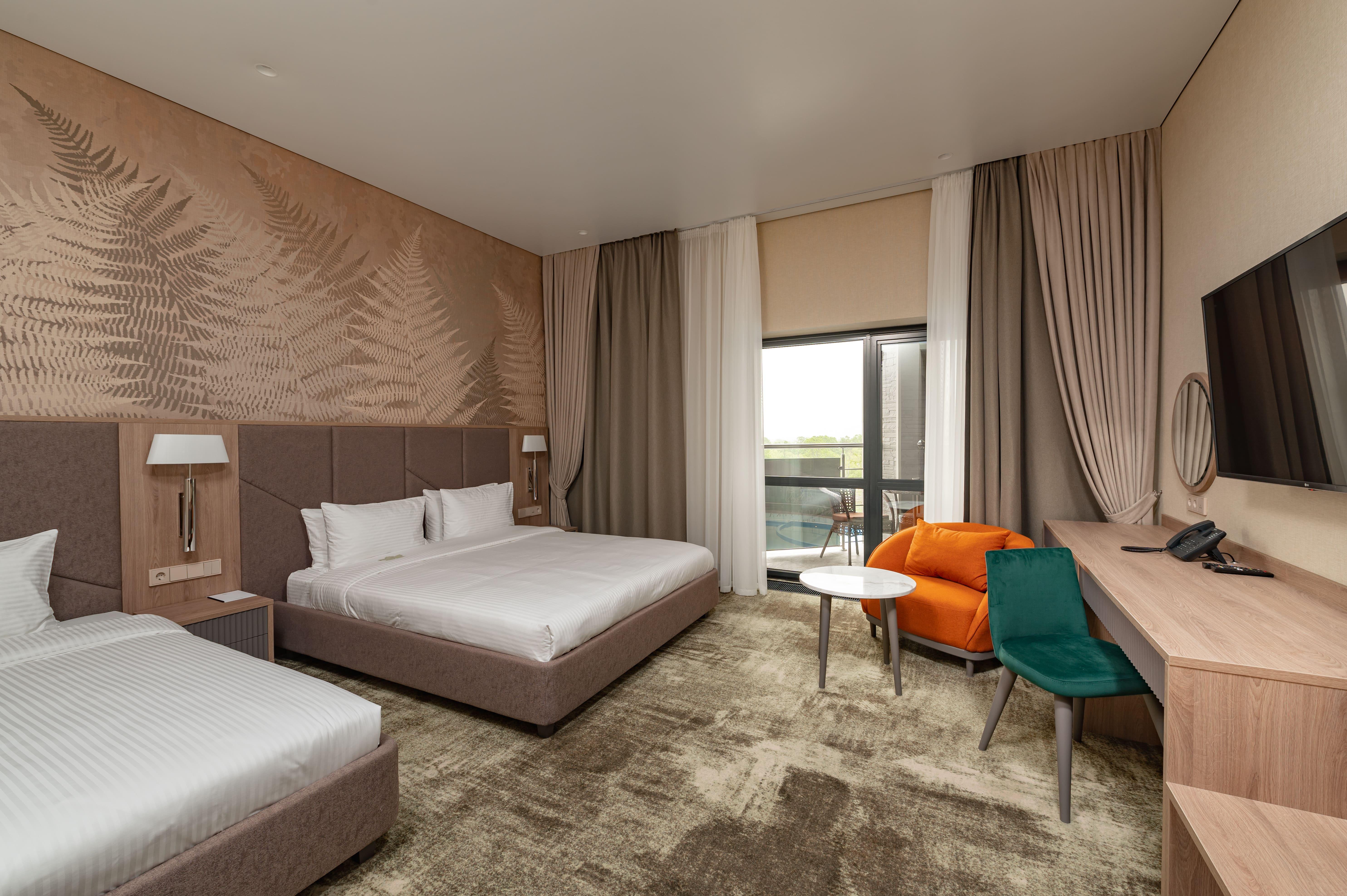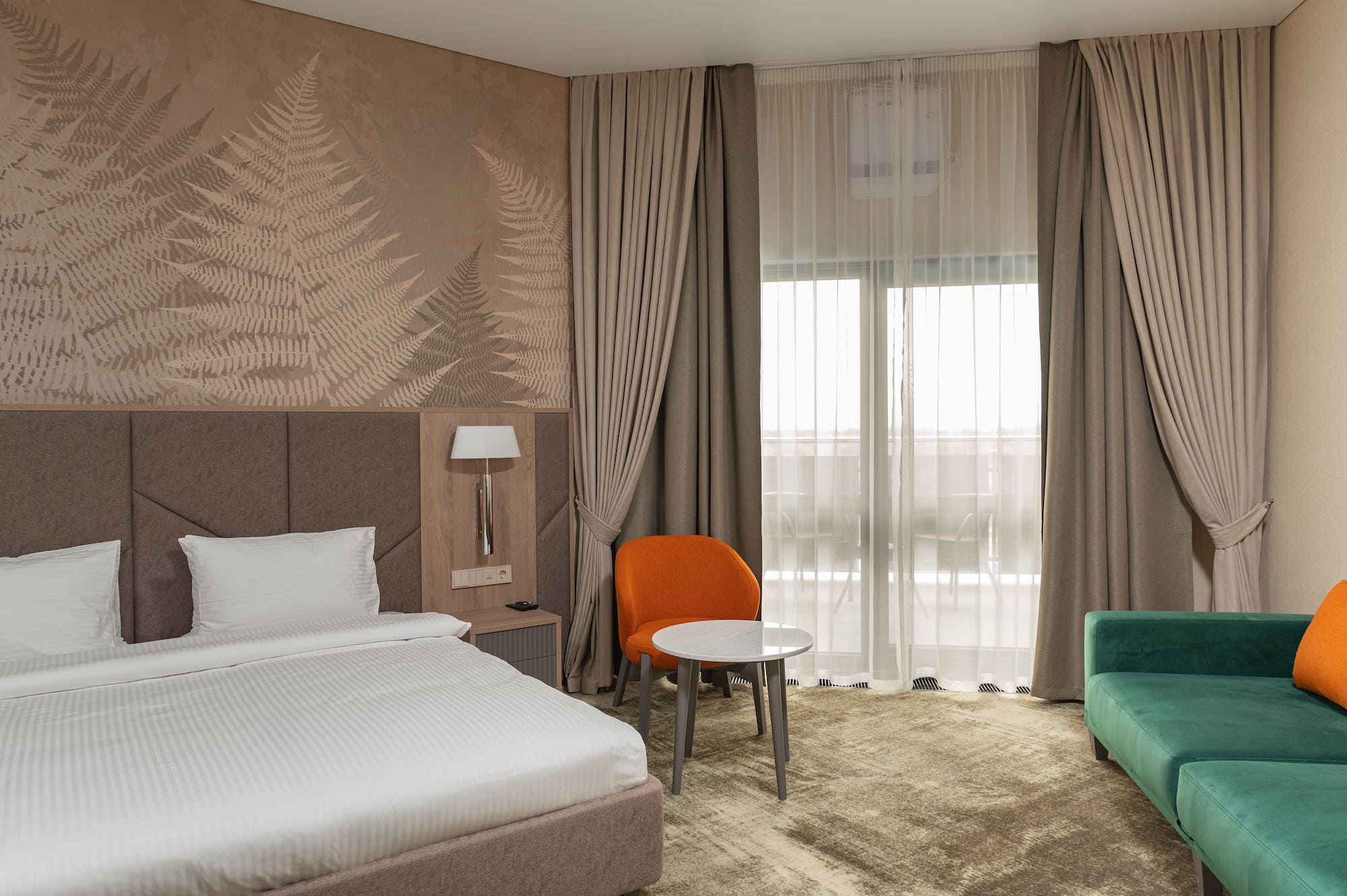 Лучший выбор для семьи: в номере площадью 34 квадратных метра есть просторная двуспальная кровать и дополнительное спальное место (односпальная кровать либо диван). Спокойные естественные оттенки «разбавлены» яркой обивкой стульев. В номере можно расслабиться на удобнейших матрасах или за просмотром телевизора, а также поработать: для этого здесь есть письменный стол и бесплатный стабильный WiFi. В ванной комнате — все нужные предметы личной гигиены, косметика для душа премиум-сегмента, фен, косметическое зеркало.