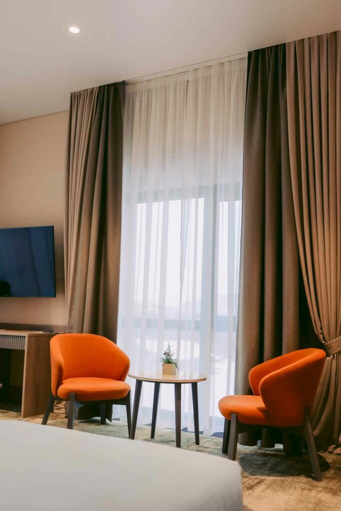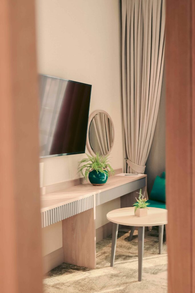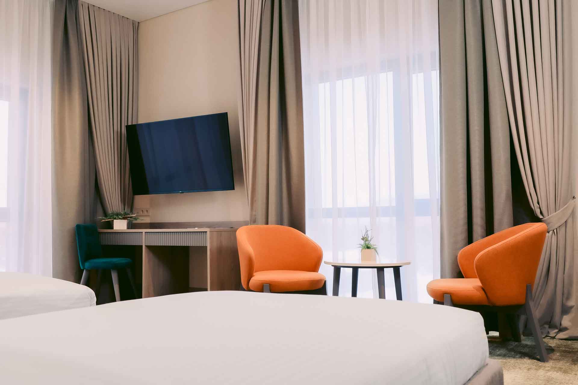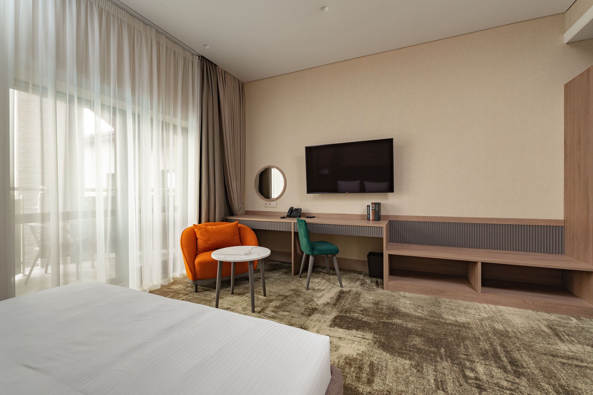 Лучший выбор для семьи: в номере площадью 34 квадратных метра есть просторная двуспальная кровать и дополнительное спальное место (односпальная кровать либо диван). Спокойные естественные оттенки «разбавлены» яркой обивкой стульев. В номере можно расслабиться на удобнейших матрасах или за просмотром телевизора, а также поработать: для этого здесь есть письменный стол и бесплатный стабильный WiFi. В ванной комнате — все нужные предметы личной гигиены, косметика для душа премиум-сегмента, фен, косметическое зеркало.