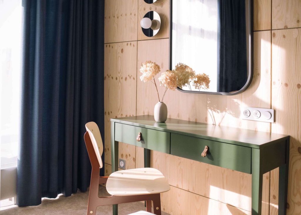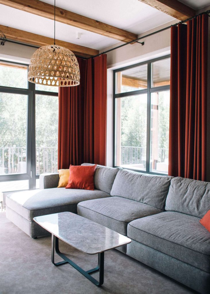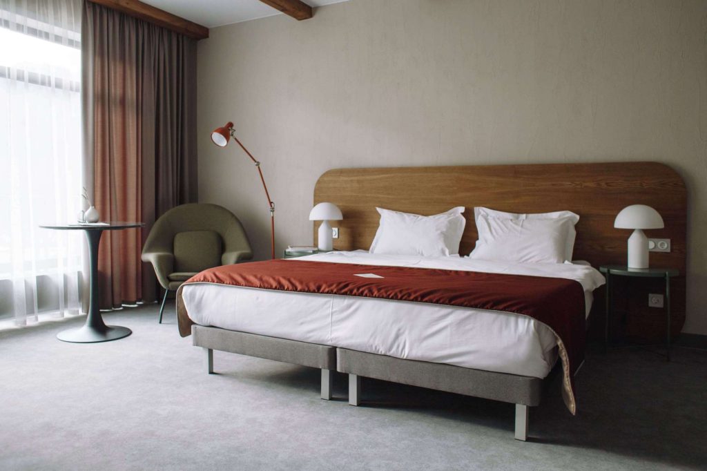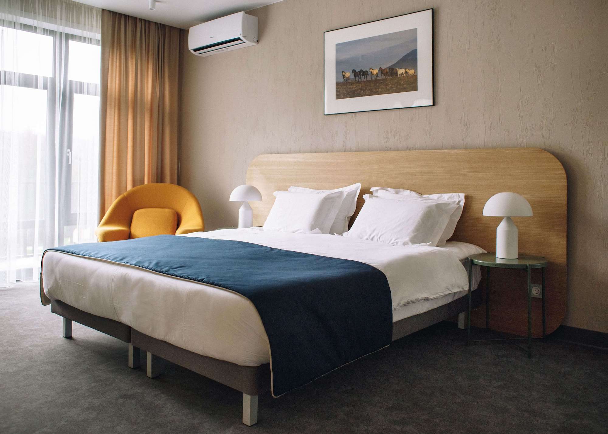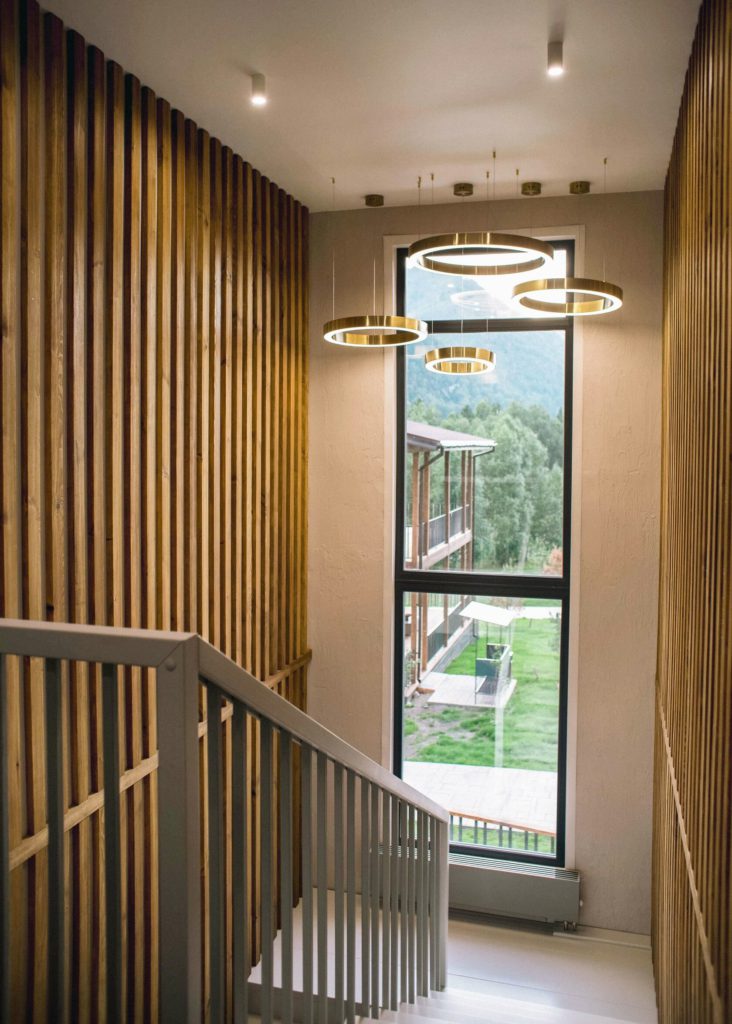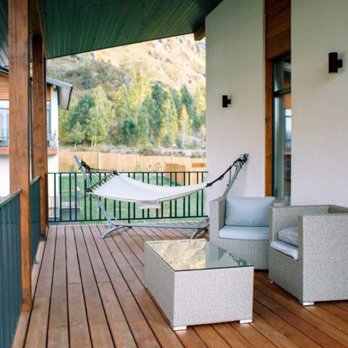Двухместный номер площадью 35 кв.м. Расположен в двухэтажном корпусе с 18 номерами. Есть возможность взять дополнительное место. Кровати — double или twin, по запросу предоставляется детская кроватка. Комната оформлена в лаконичном эко-стиле. Помимо кровати, в комнате есть мягкая мебель и журнальный столик, прикроватные столики и стильные светильники. ВАнная комната с душевой кабиной оформлена в стиле лофт, в ней есть всё необходимое: полотенца, душевые принадлежности, фен. Также в каждом номере есть балкон со стульями и столиком, с видом на горы и реку.