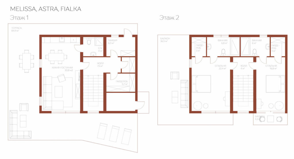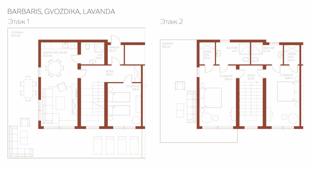 Коттедж площадью 130 кв.м. рассчитан на 4 гостей. 2 спальни с панорамными окнами и собственными балконами, общая терраса площадью 85 кв.м., 3 санузла, большие гардеробные (для каждой из спален и общая на первом этаже), кухня-гостиная с обеденной зоной и мягкой мебелью. Кухня оборудована микроволновой печью и чайником, есть вся необходимая посуда и столовые приборы. Кровати в спальных комнатах на выбор — double или twin. Есть телевизор, фен, мини-бар, бесплатный Wi-Fi.