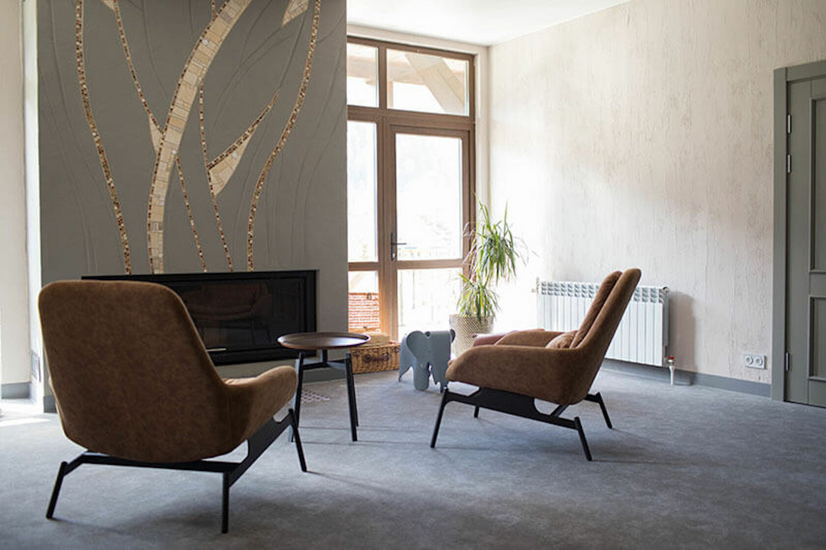 Мини-отель предназначен для групповых заездов. В просторном двухэтажном здании 8 номеров, каждый из них площадью 20 кв.м., а также общая гостиная с камином. В номерах кровати double или twin, собственные ванные комнаты, все душевые принадлежности и средства гигиены, сейфы, мини-бары. Бесплатный Wi-Fi, так же как и на территории всего отеля. В номерах есть террасы или балконы с видом на реку и горы.