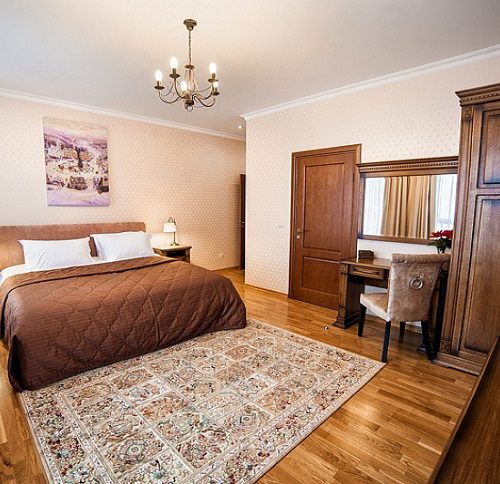 Просторный и уютный номер для 2 человек. Здесь есть большая кровать, ванная, косметические принадлежности, махровые полотенца. Предоставляются тапочки и халат. На большом телевизоре удобно будет смотреть сериалы, фильмы, важные матчи. Качественная дубовая мебель придает изюминки интерьеру. Есть балкон с прекрасным видом на горы.