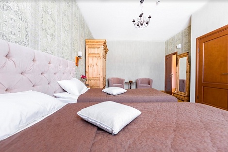 Уютный небольшой номер для 2 человек. Есть большая двуспальная кровать, ванная с косметическими принадлежностями. Предоставляются махровые полотенца, халаты, тапочки. Насладиться любимыми сериалами и фильмами поможет большой телевизор. Прочная мебель сделана из дуба.