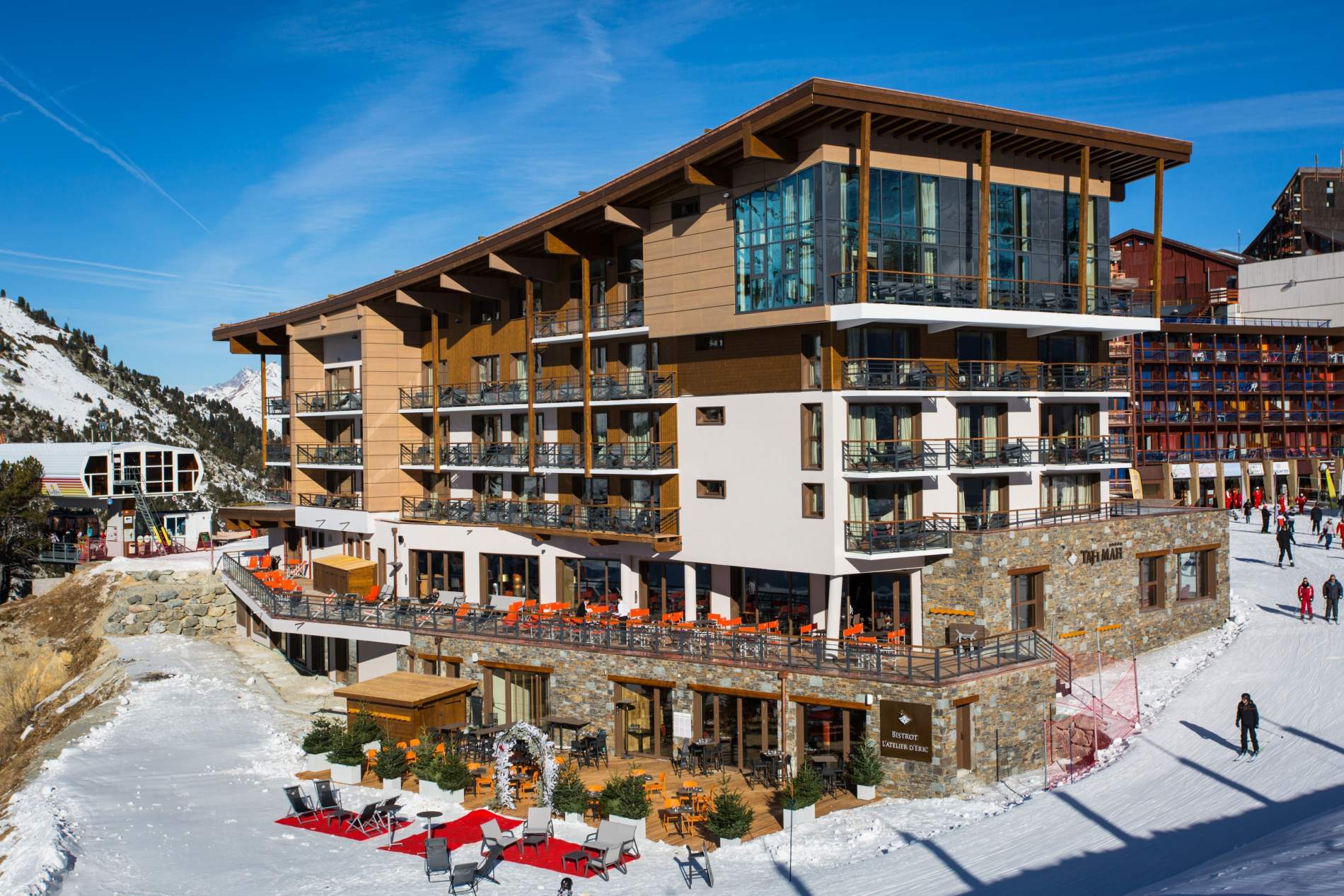 Первый пятизвездочный отель в Лез Арке, расположенный в зоне Арк-2000, с прямым доступом к склонам и подъемникам. Состоит из одного корпуса с 48 номерами и несколькими люкс-апартаментами, в том числе и двухуровневыми. Стильное оформление номеров, панорамные виды на горы, два ресторана с изысканными блюдами от шеф-повара, бар и прекрасная зона SPA с бассейном, сауной, баней и гидромассажной ванной — пребывание в Hôtel Taj-I Mah будет максимально комфортным и расслабленным, а оценка отеля в пять звезд более чем заслужена. Здесь также работает собственный пункт проката горнолыжного снаряжения. Гости отдельно отмечают удобное расположение, идеальную чистоту и радушный персонал.